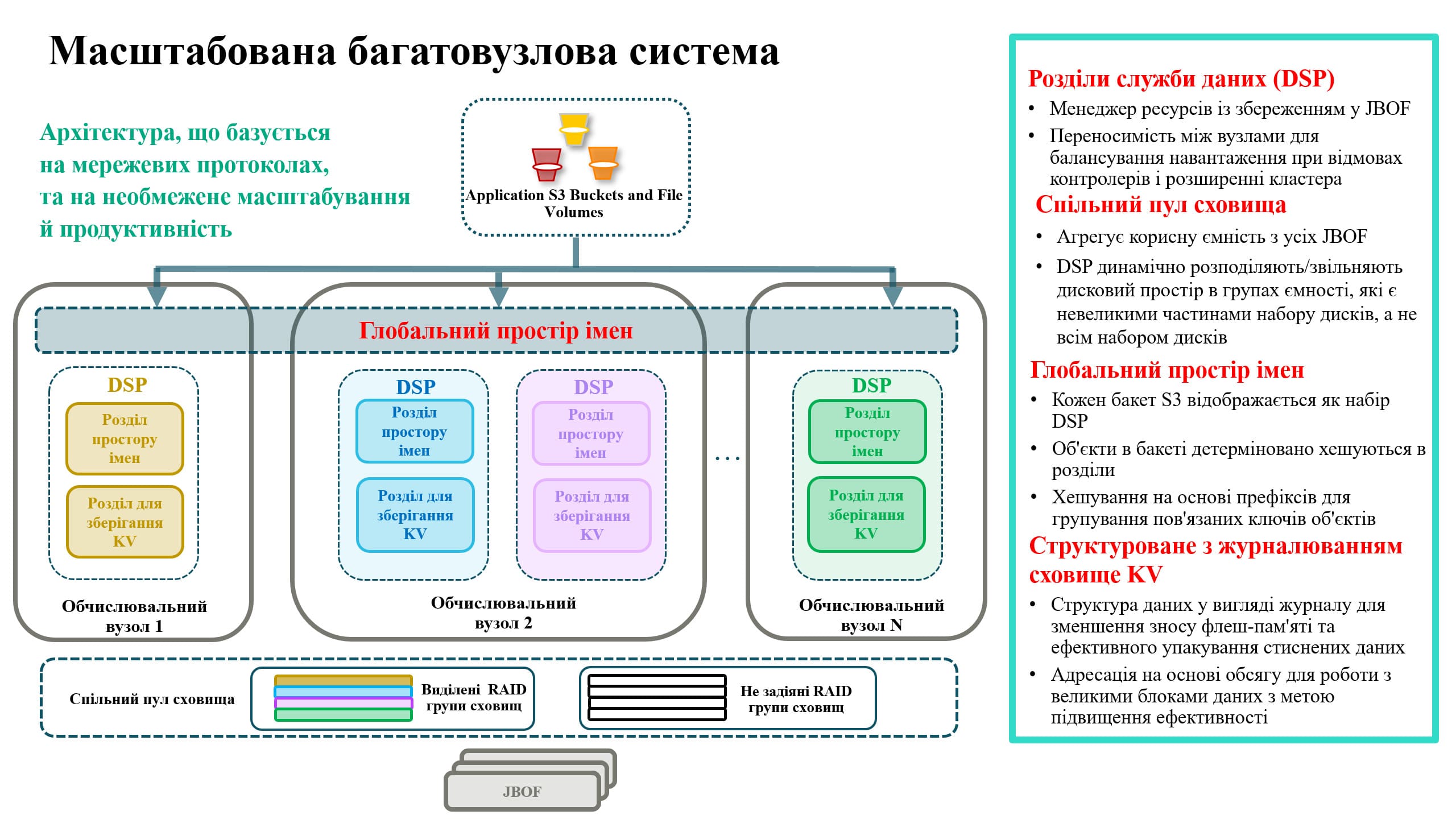 Кожен із SSD NVMe-накопичувачів, що входять до складу дискових корпусів, розділений на невеликі логічні диски, які називаються «дисклетами». Ці дисклети формують RAID-групи, розподілені по бекенду. Таким чином створюється загальний пул зберігання, доступний без обмежень для всіх вузлів кластера через єдиний глобальний простір імен, що забезпечує ефективне, високонадійне та масштабоване зберігання. Загальний пул дозволяє DSP динамічно розподіляти та вивільняти RAID-групи за потреби, забезпечуючи раціональне використання ємності. Фоновий «збір сміття» в SSD-дисках звільняє простір, повертаючи його до загального пулу. Щоб забезпечити роботу контролерних вузлів без збереження стану та уникнути необхідності в постійному кеші, частина бекенд-сховища використовується як буфер запису RAID із потрійною парністю. Більшість невеликих операцій запису можуть спочатку фіксуватися в буфері, підтверджуватися, а потім асинхронно переноситися до сховища ключ-значення (KV) із лог-структурою пакетами.